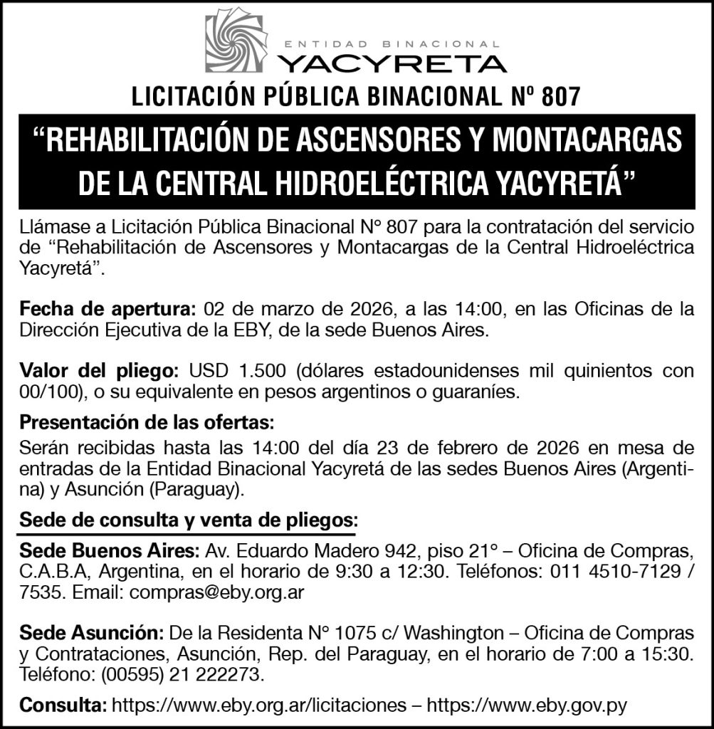 Licitación Pública Binacional N° 807 “Rehabilitación de ascensores y montacargas de la Central Hidroeléctrica Yacyretá”.