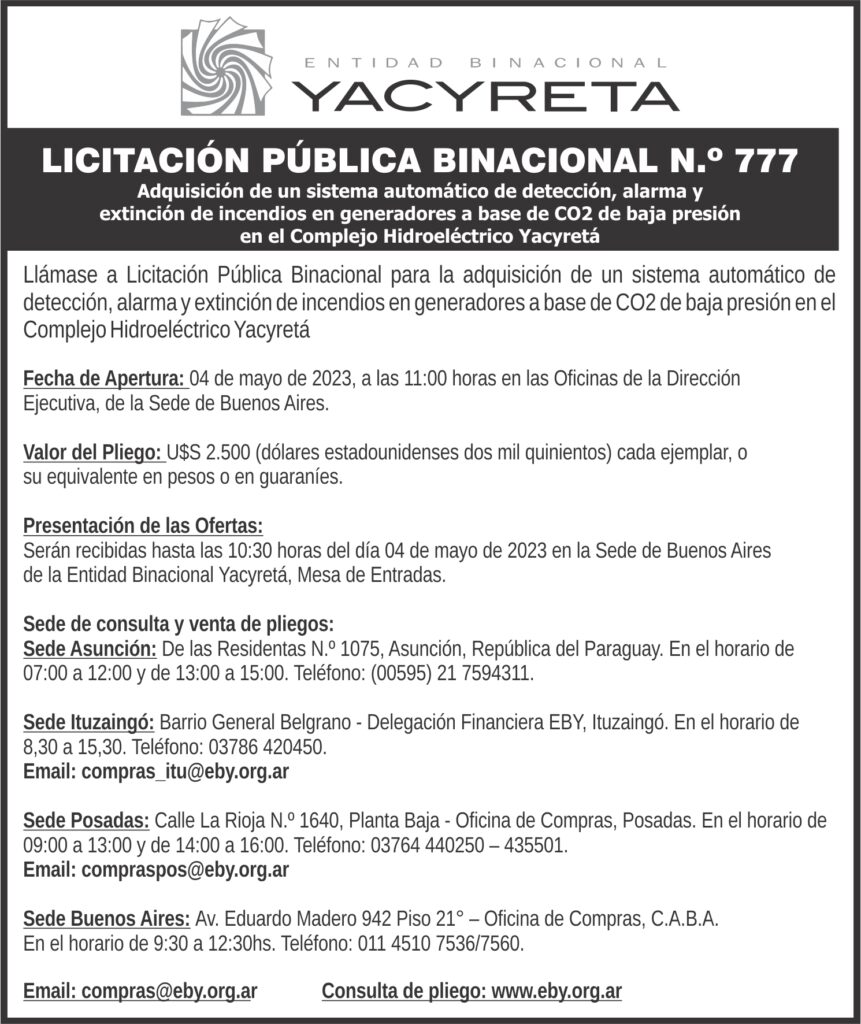 Licitación Pública Binacional Nº 777 – Sistema automático de detección, alarma y extinción de incendios en generadores