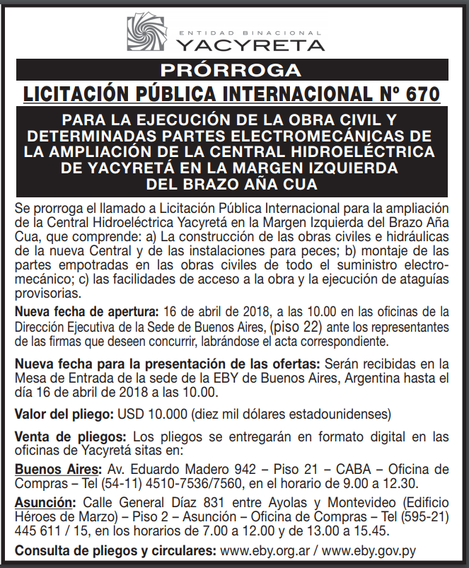 Licitación Pública Internacional N° 670 / Obra Civil y Determinadas Partes Electromecánicas – Aña Cuá (Prórroga)