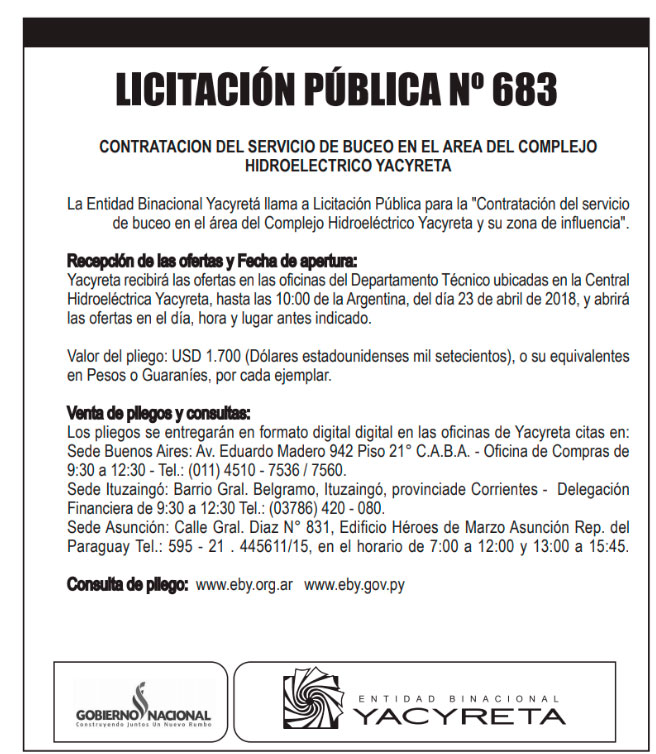 Licitación Pública N° 683 / Contratación de Servicio de Buseo en Complejo Yacyretá