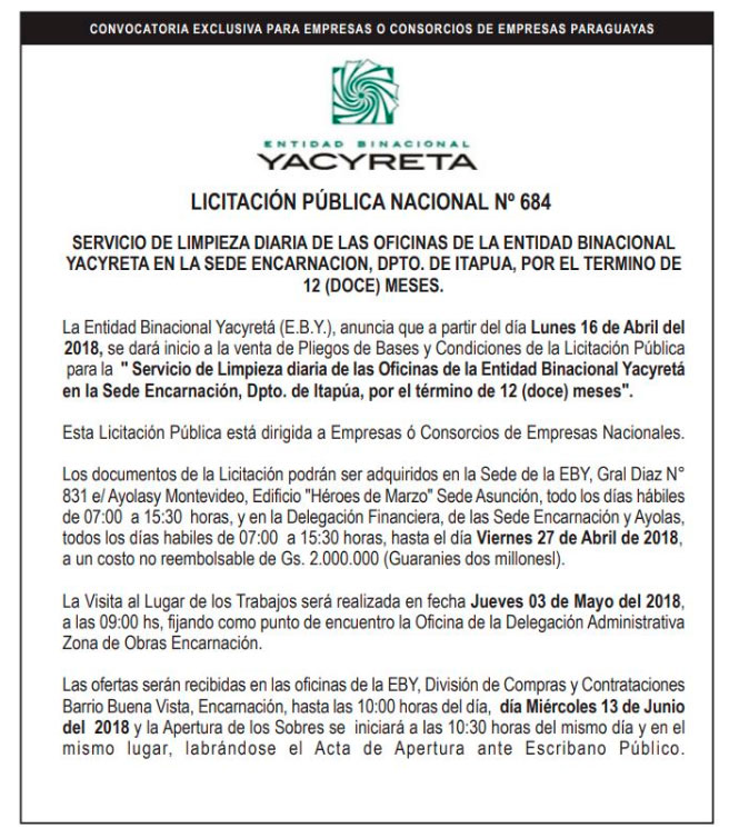 Licitación Pública N° 684 / Servicio de limpieza de oficinas de Yacyretá en Encarnación