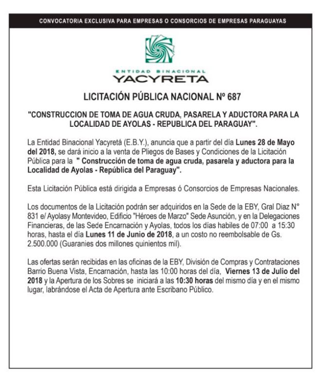 Licitación Pública N° 687 / Construcción de toma de agua cruda, pasarela y aductora en Ayolas