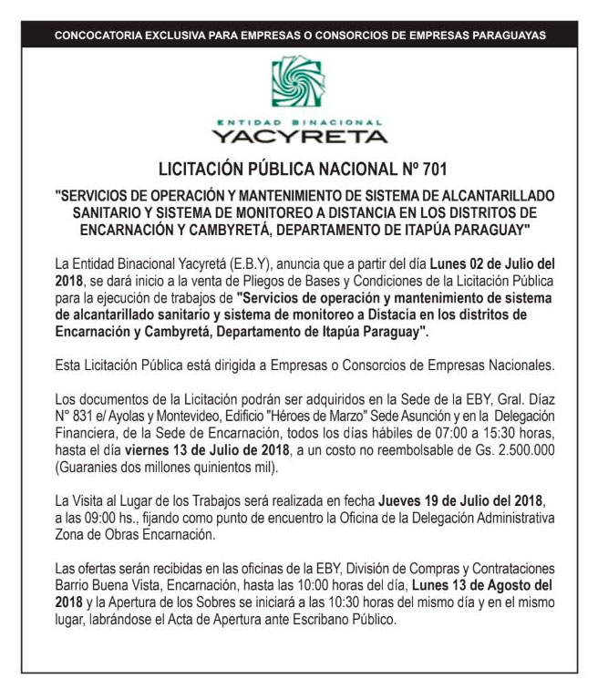 Licitación Pública N° 701 / Operación y Mantenimiento de Alcantarillado Sanitario en Encarnación y Cambyretá