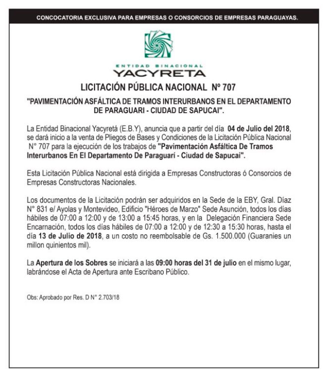 Licitación Pública N° 707 / Pavimentación asfáltica en Sapucai, Paraguarí