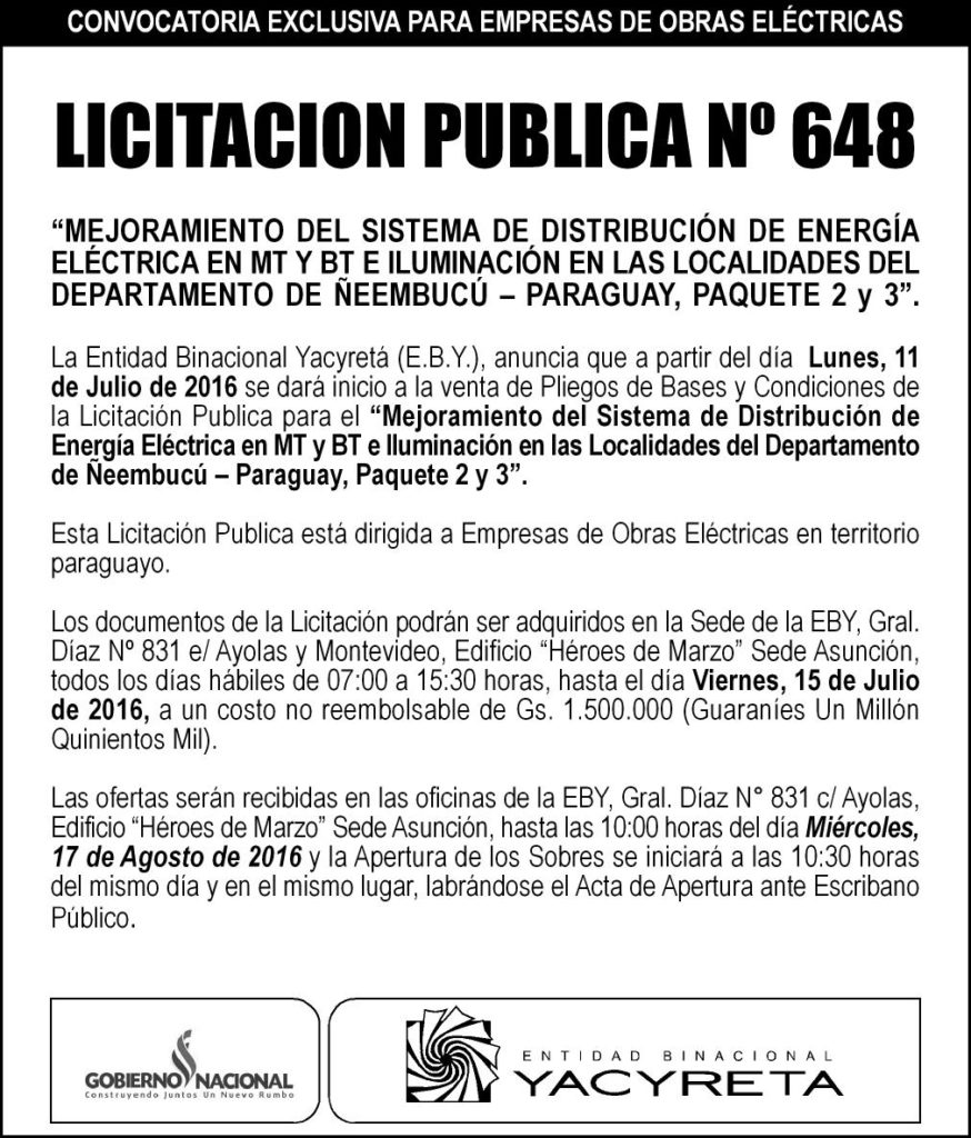 Licitación Pública Nacional N° 648 / Mejoramiento del sistema de distrbución de energía eléctrica