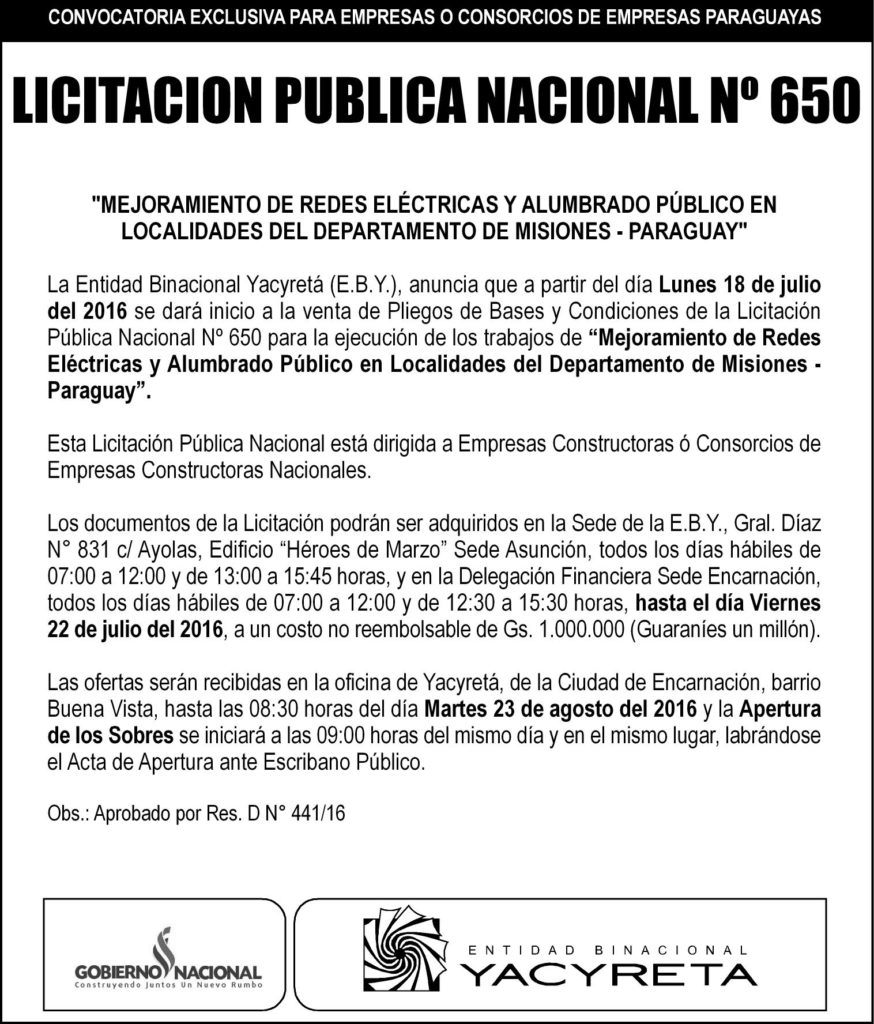 Licitación Pública Nacional N° 650 / Mejoramiento de redes eléctricas y alumbrado público