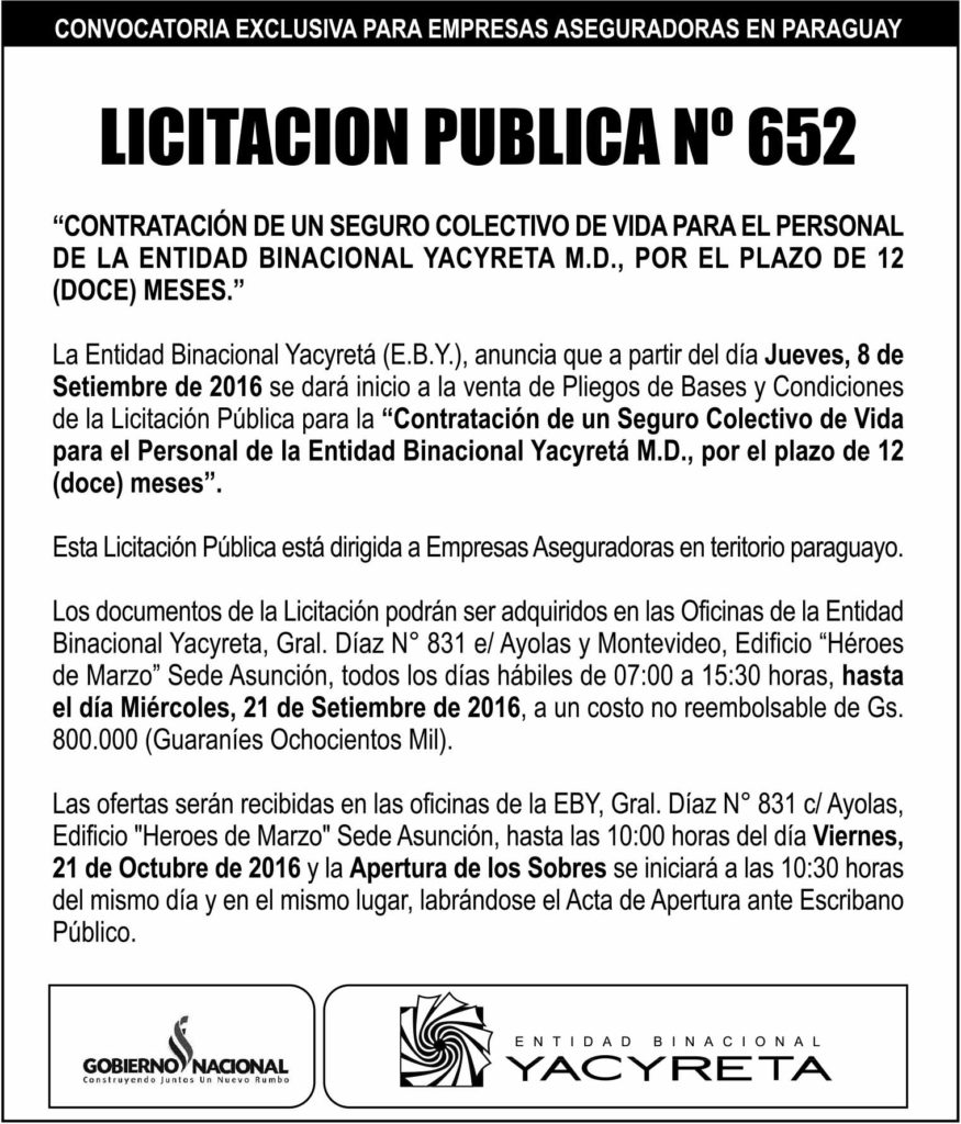 Licitación Pública Nacional N° 652 / Seguro colectivo de vida para el personal de la EBY