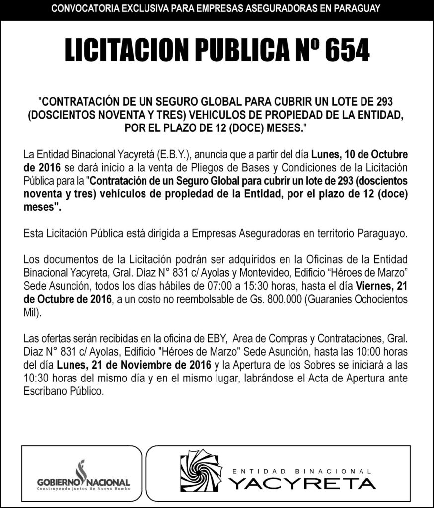 Licitación Pública Nacional N° 654 / Seguro global para vehículos de la EBY
