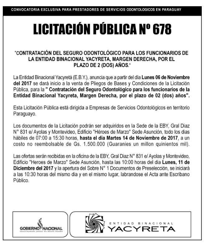 Licitación Pública Nacional N° 678 / Contratación de seguro odontológico para el personal de Yacyretá