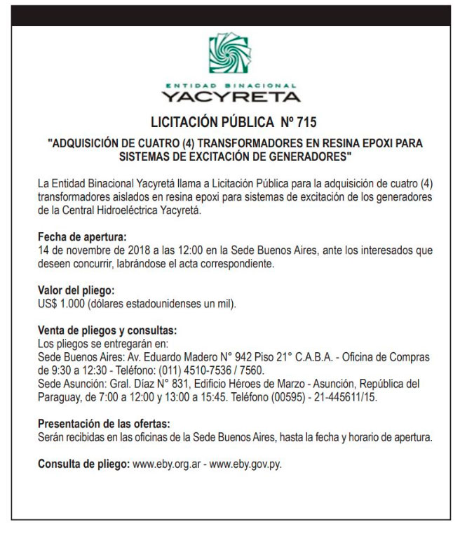 Licitación Pública Nacional N° 715 – Adquisición de Transformadores en Resina EPOXI