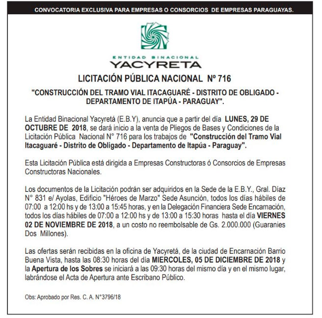 Licitación Pública Nacional N° 716 – Construcción de tramo vial Itacaguaré en Obligado, Itapúa