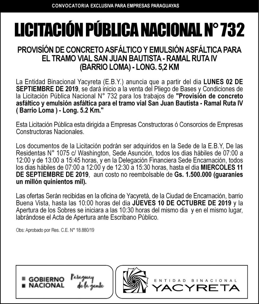 Licitación Pública Nacional N° 732 – Provisión de asfalto para tramo San Juan Bautista – Ramal Ruta IV (Barrio Loma)