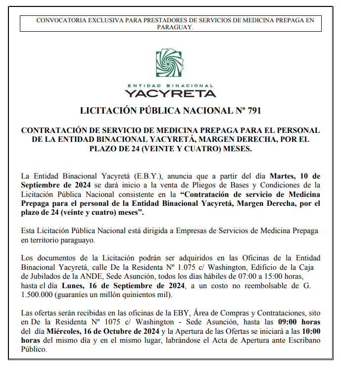 LICITACIÓN PÚBLICA NACIONAL Nº 791 – CONTRATACIÓN DE SERVICIO DE MEDICINA PREPAGA PARA EL PERSONAL DE LA EBY