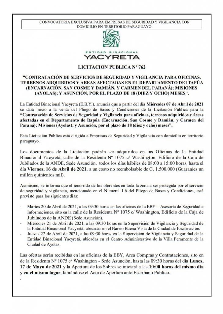 Licitación Pública Nº 762 – Contratación de Servicios de Seguridad y Vigilancia