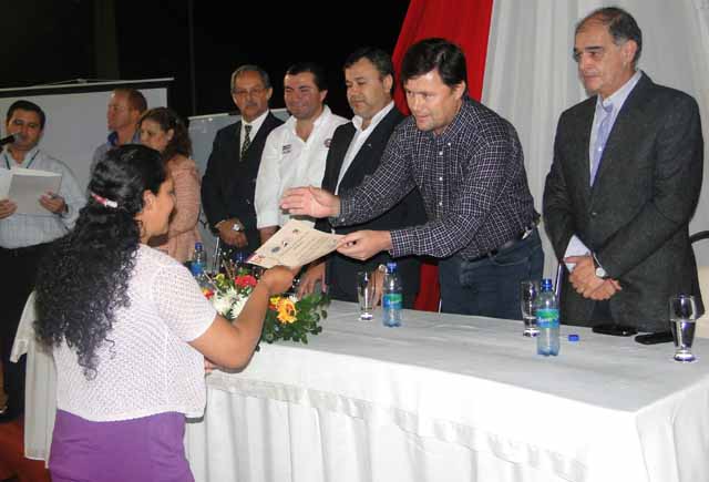 Foto: El consejero de la EBY Guido Reckziegel entrega el certificado a una de las egresadas. Lo acompañan en la mesa otros funcionarios de la EBY y de la Sinafocal.
