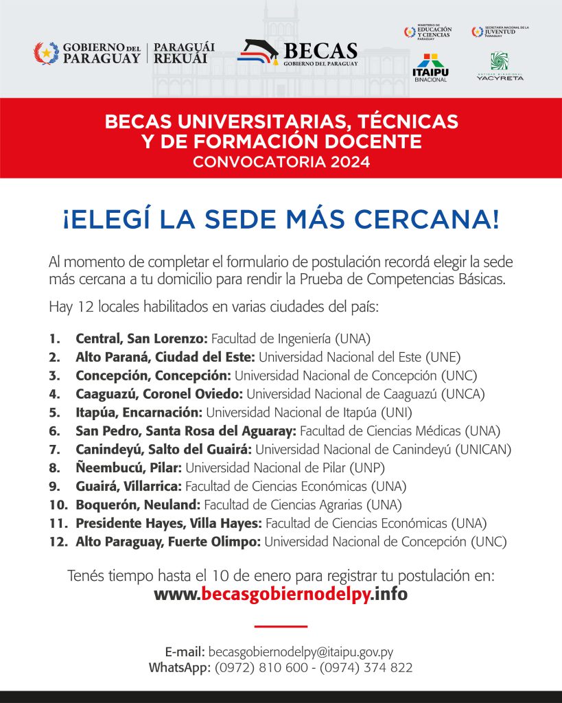 El Gobierno del Paraguay anuncia la habilitación de 12 sedes para la Prueba de Competencias Básicas de Matemática y Castellano, programada para el próximo 10 de febrero, en el marco del proceso de selección de las becas de estudios, convocatoria 2024. Esta medida busca facilitar el acceso a los postulantes, ya que les permite elegir el local más próximo a su residencia.