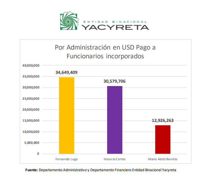 - Con el ánimo de referenciar lo que significan estos números en la administración de la Entidad Binacional al Yacyreta, de manera a obtener una mirada más desapasionada y comparativa de esta situación, le acercamos los mismos datos extraídos de las administraciones de la EBY en los Gobiernos anteriores de Fernando Lugo, Federico Franco y Horacio Cartes: