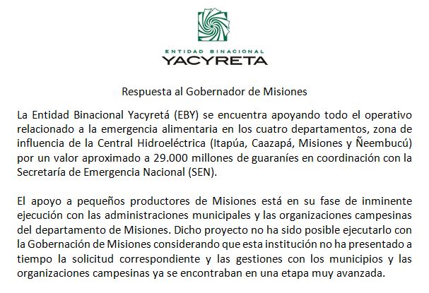 El apoyo a pequeños productores de Misiones está en su fase de inminente ejecución con las administraciones municipales y las organizaciones campesinas del departamento de Misiones. Dicho proyecto no ha sido posible ejecutarlo con la Gobernación de Misiones considerando que esta institución no ha presentado a tiempo la solicitud correspondiente y las gestiones con los municipios y las organizaciones campesinas ya se encontraban en una etapa muy avanzada.