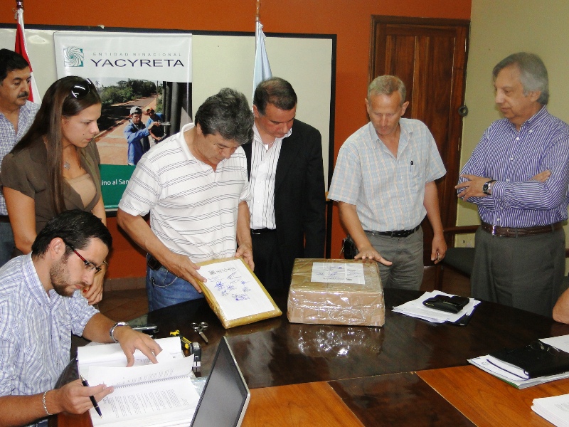 La apertura de sobres contó con la presencia de autoridades de la EBY, la escribana pública Lilian Patricia Rienzi, y representantes del Consorcio Canales del Sur y CDD Construcciones SA.
