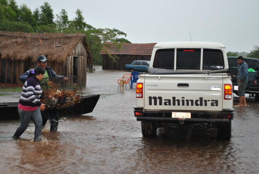 Pese a las intensas precipitaciones, las familias son ayudadas con vehículos de la EBY, a más de ser asistidas con víveres y carpas para los que se instalan en un campamento provisorio.