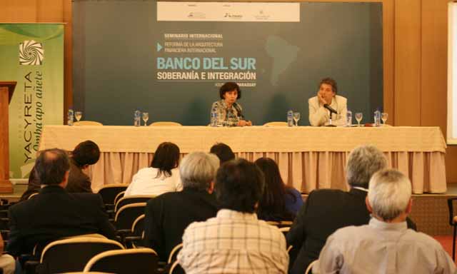 Con apoyo de la Entidad Binacional Yacyretá (EBY) la Asesoría de Relaciones Internacionales de la Presidencia de la República organizó el seminario “Reforma de la Arquitectura Financiera Internacional, Banco del Sur: Soberanía e Integración” en el Hotel Granados Park, los días 24 y 25 de noviembre. El evento contó con la participación de varios expositores extranjeros.Disertantes extranjeros y nacionales expusieron acerca de la constitución de una nueva Arquitectura Financiera Regional, la cual se volvió imprescindible según el contexto internacional marcado por una crisis económica.