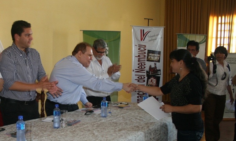 La entrega de aportes fue realizada en el salón de actos de la Gobernación y contó con la participación del director paraguayo de la EBY; el ministro de Educación y Cultura, Víctor Ríos; el gobernador de Ñeembucú, Pedro Aliana, el ministro de la Secretaría de Información y Comunicación para el Desarrollo, Augusto Dos Santos; el coordinador general del Área Social Pablino Cáceres y autoridades locales.