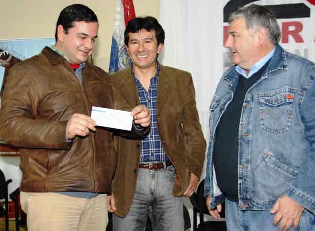 Foto: Carlos Arrechea intendente de Ayolas y presidente de la Asociación de Intendentes de Misiones muestra el cheque. Observan los diputados Juan Roberto Espínola y Hugo Capurro.